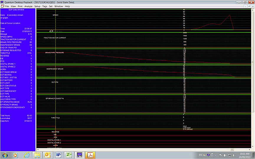 Les enregistrements représentant le plus grand intérêt portaient sur les paramètres suivants : la vitesse, le frein automatique, la pression dans la conduite générale, le frein direct, la pression dans les cylindres de frein et la position du levier du manipulateur, de la poignée du frein rhéostatique et du levier d’inversion du sens de marche (« inverseur » en abrégé). Les heures ont été enregistrées à un niveau de résolution de 1 seconde, et les distances et les points milliaires jusqu’à 0,01 mille, ou 53 pieds, ce qui signifie une valeur récapitulative maximale de 26,5 pieds.