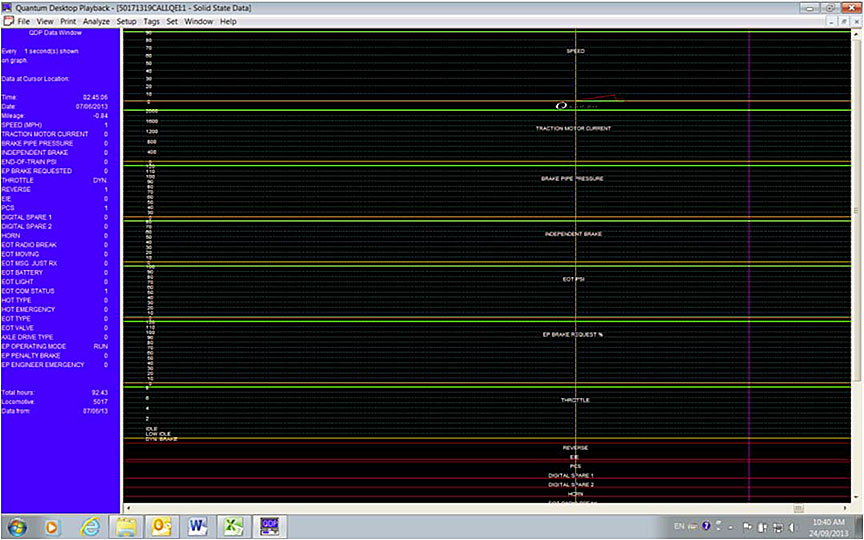 Les enregistrements téléchargés du CEL portaient sur une période de 5 jours, depuis le 2 juillet, et totalisaient 2191 pages de données. La figure 3 montre un graphique comprimé de tous les enregistrements. En plaçant des balises à des moments désignés, on a fait un zoom avant (figure 4) sur la période comprise entre l’arrêt du train à Nantes et l’arrêt définitif après l’accident. Les figures 5 à 7 montrent d’autres graphiques zoomés pour la période d’arrêt du moteur, la dérive et le dernier mouvement arrière (vers l’ouest).