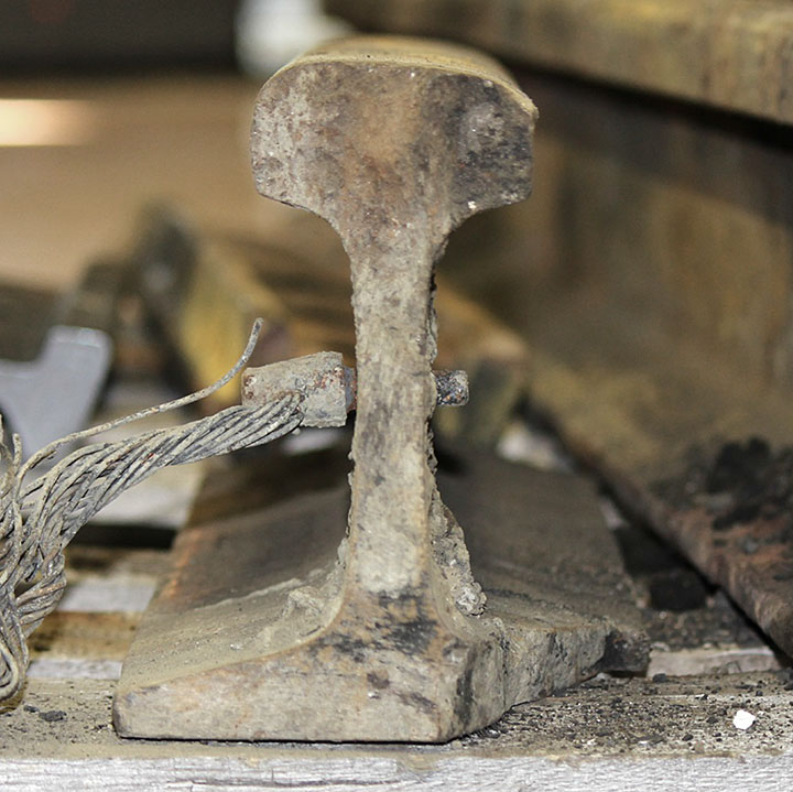 Sur le site de l’événement, on a découpé les rails du cœur de croisement raccordés aux rails de prolongement de pointe pour en faciliter le transport au Laboratoire d’ingénierie du BST (la partie inférieure de la figure 1d montre les extrémités coupées).