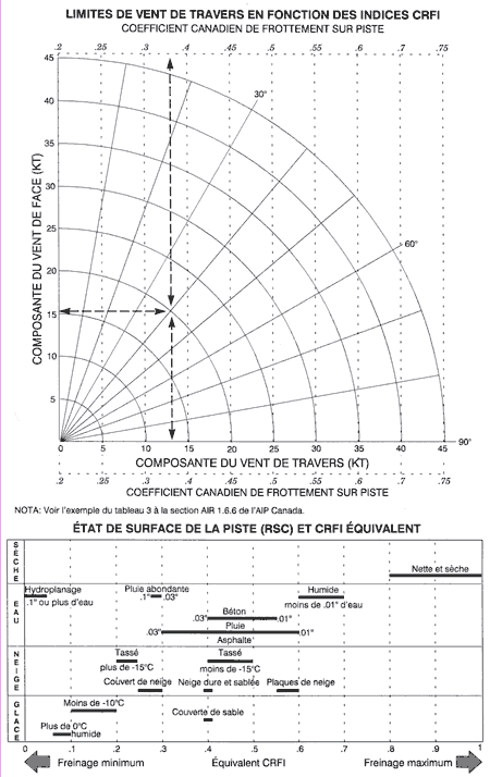 Tant la Publication d'information aéronautique (A.I.P. Canada), section AIR 1.6.6, que le Supplément de vol - Canada (page A49) contiennent un tableau de référence qui indique les composantes maximales de vent de travers qui sont recommandées en fonction des CRFI signalés (voir l'annexe C). À la vitesse maximale des rafales communiquée pendant le vol, à savoir 45 noeuds, la composante de vent de travers aurait été de quelque 40 noeuds avec un coefficient minimal recommandé de frottement sur piste d'environ 0,7. Un tel chiffre est proche du coefficient de frottement que l'on peut s'attendre à trouver sur une piste sèche et dégagée.