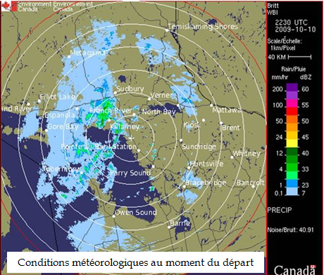 Le front froid se déplaçait vers l'est à 30 nœuds, en doublant sa vitesse mentionnée dans la GFA précédente. On avait estimé qu'il arriverait dans la région de Sudbury à peu près en même temps que l'avion. Le front froid ayant déjà traversé Sault-Sainte-Marie, on avait relevé l'information suivante : un plafond à 800 pieds agl et une visibilité de 3 sm dans des averses de neige.
