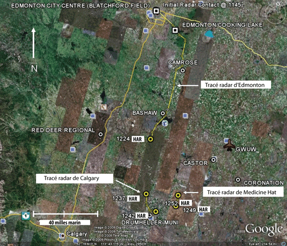 L'avion a quitté l'aéroport City Centre d'Edmonton à 11 h 47Note de bas de page 1 et a été observé sur le radar d'Edmonton de NAV CANADA au décollage de la piste 30 (voir Annexe A — Tracé radar de C-GWUW). L'avion est resté en contact avec le radar d'Edmonton jusqu'à 12 h 25. Le tracé radar indique une trajectoire de vol en direction sud passant par Camrose, puis Bashaw (Alberta) et au-delà. Les altitudes enregistrées étaient comprises entre 4 000 pieds environ au-dessus du niveau de la mer (asl) jusqu'à 4 600 pieds asl. À 12 h 37, le radar de Calgary a détecté l'avion dans les environs de Drumheller (Alberta) et a gardé le contact jusqu'à 12 h 43. Le tracé enregistré montre que l'avion a viré à gauche en direction du nord-est. L'avion est apparu sur le radar de Medicine Hat (Alberta) de 12 h 49 jusqu'à 12 h 52 à environ 42 milles nautiques (nm) dans le sud-ouest du lieu de l'accident. L'avion volait à une vitesse sol d'environ 160 nœuds à 4 400 pieds asl, soit approximativement 1 500 pieds sol (agl) à ce moment-là.