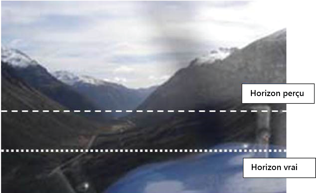 On enseigne aux pilotes à compter sur les instruments de l’avionFootnote 28 pour lutter contre les effets de la désorientation spatiale. En montagnes, le pilote doit donc diviser son attention entre l’observation des instruments de bord à l’intérieur du poste de pilotage et l’observation du milieu environnant à l’extérieur du poste de pilotage afin d’éviter le relief. L’utilisation des instruments dans le poste de pilotage plutôt que l’observation des repères visuels extérieurs, en situation d’urgence, n’est pas enseignée aux pilotes privés et professionnels et elle est très difficile à réaliser lorsque l’impulsion pousse le pilote à vouloir regarder à l’extérieur. Les illusions en régions montagneuses sont dangereuses pour les personnes qui n’ont pas l’expérience ou la formation nécessaires pour les reconnaître et les compenser.