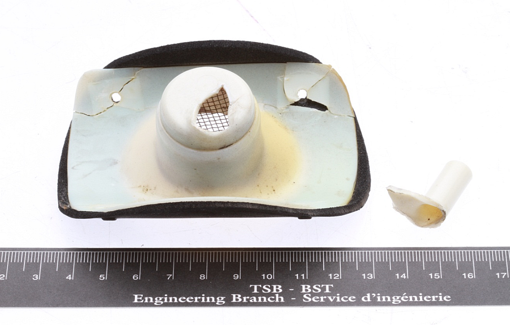 Durant l'examen subséquent effectué à son installation régionale, le Bureau de la sécurité des transports (BST) a déterminé que la prise d'air de l'avertisseur de décrochage était fissurée. On a envoyé l'avertisseur de décrochage au Laboratoire d'ingénierie du BST aux fins d'examen. L'examen au microscope de la cassure a révélé qu'une zone s'était fracturée par le passé, comme l'indiquait la décoloration des surfaces fracturées. Une autre zone de la cassure montrait une fracture plus récente (photo 2), que l'on a attribué aux forces de l'impact. Selon les procédures d'entretien du fabricant, l'inspection de l'avertisseur de décrochage, y compris son fonctionnement, a lieu lors de chaque vérification « A »