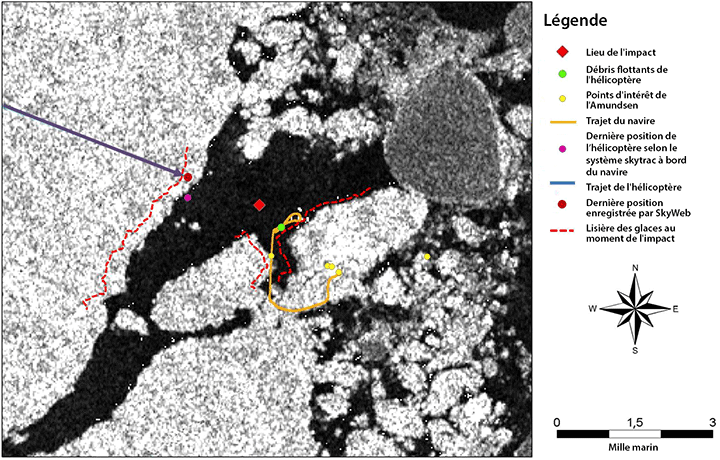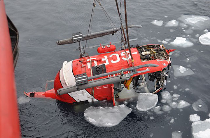 À 17 h 38, le CCG364 a informé le NGCC Amundsen qu'il prévoyait arriver dans 10 minutes. Comme l'hélicoptère n'était toujours pas de retour à 18 h 5, on a vérifié sa position au moyen du système de suivi des vols, qui indiquait que l'hélicoptère se trouvait à 3,2 milles marins du navire. Dès 18 h 18, l'équipage du NGCC Amundsen a tenté à plusieurs reprises de communiquer par radio avec le pilote, mais sans succès. À 18 h 24, le navire a fait route vers la dernière position de l'hélicoptère indiquée par le système de suivi des vols. À 18 h 47, on a trouvé des débris. L'embarcation rapide de sauvetage du navire a été mise à l'eau pour tirer les 3 occupants des eaux; aucun d'entre eux n'a survécu. L'hélicoptère a coulé par 458 m d'eau. L'accident est survenu en plein jour. Le système satellite n'a reçu aucun signal de l'émetteur de localisation d'urgence de 406 MHz.