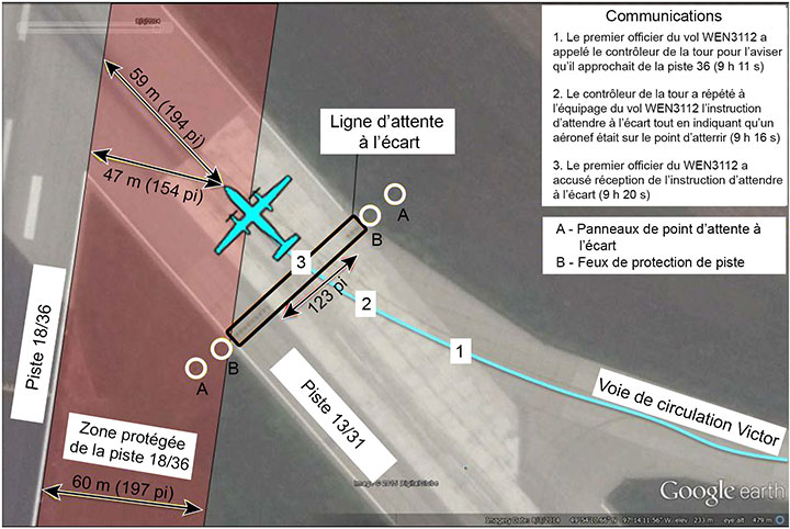 Le premier officier du vol WEN3112 a réglé la radio à la fréquence de la tour et, à 9 h 11 s, a avisé le contrôleur de la tour qu'il approchait de la piste 36. À 9 h 16 s, le contrôleur de la tour a répété l'instruction d'attendre à l'écart de la piste 36 tout en indiquant qu'un aéronef était sur le point d'y atterrir. Le premier officier a accusé réception de l'instruction d'attendre à l'écart de la piste à 9 h 20 s (annexe A – Zone de l'incursion de piste).