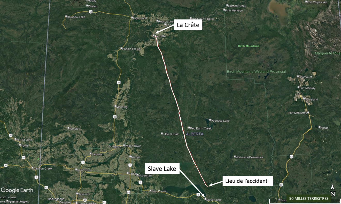 L’aéronef a décollé à 9 h dans des conditions météorologiques de vol à vue, pour d’abord monter à 3500 pieds ASL en direction sud (figures 1 et 2). En route vers CYZH, l’aéronef a atteint une altitude de 4000 pieds ASL avant de descendre, probablement à cause des plafonds de nuages. Lorsque l’aéronef se trouvait à 14 milles marins (NM) au nord de CYZH, le pilote a modifié sa destination de CYZH à CYLL dans l’appareil GPS (système de positionnement mondial). La trajectoire de l’aéronef a alors viré vers l’est, en direction de CYLL et d’un relief ascendant. À ce moment-là, l’aéronef évoluait à 3000 pieds ASL ou à 500 pieds au-dessus du relief.