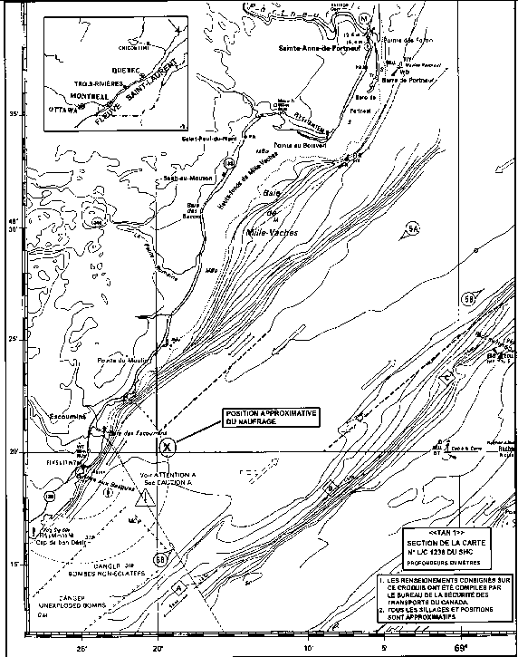 Le 12 septembre 1993, les passagers se sont présentés au hangar de la compagnie, où ils ont reçu des combinaisons isothermiques et de brefs renseignements sur le type d'excursion qu'ils s'apprêtaient à faire à bord du «TAN 1». Vers 15 h Note de bas de page 3, les passagers se sont dirigés vers la jetée de l'Anse aux Basques pour monter à bord de l'embarcation. Avant le départ, le patron leur a expliqué qu'ils devaient demeurer assis pendant toute la durée de l'excursion, sauf lorsque l'embarcation serait immobile pour favoriser l'observation des mammifères marins. Toutefois, les passagers n'ont reçu aucune directive en ce qui concerne l'endroit où étaient entreposés les gilets de sauvetage, ni sur la façon de les enfiler. Les gilets se trouvaient dans un caisson sous le pont, mais il n'y avait aucune inscription à cet effet.