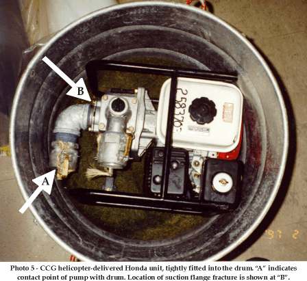 Il a été établi que la pompe Honda livrée par l'hélicoptère ne pouvait pas fonctionner parce que la bride du tuyau d'aspiration était brisée. Même si l'on ne sait pas exactement à quel moment la bride s'est rompue, la pompe a dû être endommagée soit après son départ du dépôt d'entretien, soit à bord de l'hélicoptère ou pendant sa descente de l'hélicoptère jusqu'à la surface de l'eau, ou encore pendant que l'équipage du «SCOTIA GOLD» la repêchait.
