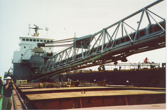 Le mât de déchargement a subi d'importants dommages aux cylindres du circuit hydraulique du mécanisme d'orientation arrière de tribord et avant de bâbord quand l'air emprisonné dans les pots de presse, comprimé de façon excessive, a rompu les cylindres. La trémie de déchargement a été endommagée, tout comme la passerelle de tribord et les lisses inférieures, qui ont été enfoncées au point de contact avec les lampadaires.