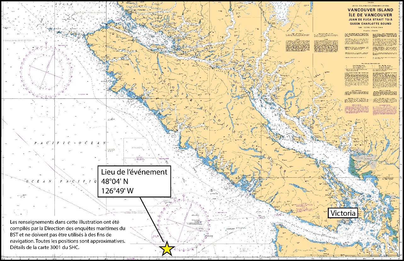 Le 11 août, aux premières heures du matin, l’eau a commencé à s’accumuler dans la section arrière de la salle des machines. Le capitaine a laissé la timonerie sans surveillance et a placé la pompe portative supplémentaire dans la salle des machines, mais l’infiltration d’eau s’est poursuivie et le navire a commencé à couler. Il a alors ordonné aux membres de l’équipage de se préparer à abandonner le navire, est retourné à la timonerie et, à 1 h 58, a lancé un appel de détresse Mayday indiquant que le navire se trouvait à la position approximative de 48°04′ N et 126°49′ W, qu’il y avait un problème à bord et qu’ils pourraient avoir besoin d’aide (figure 2).