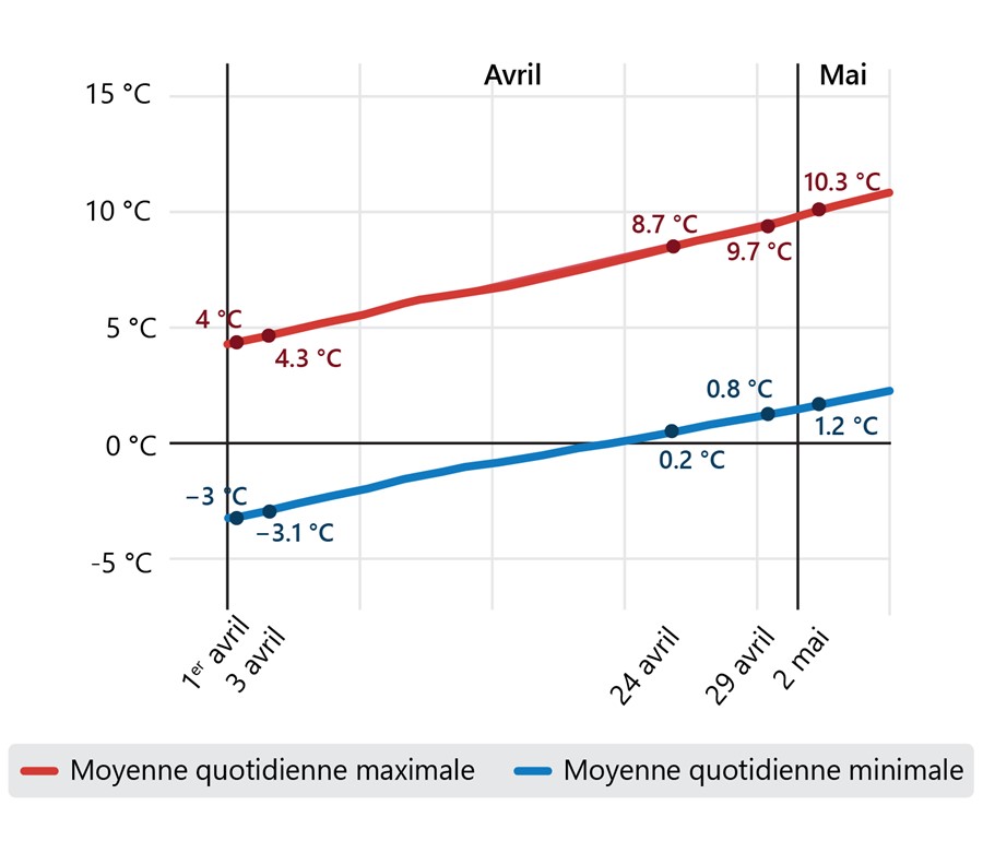 Les températures moyennes au début du mois d’avril sont généralement inférieures ou proches du point de congélation, comparativement aux températures à la fin du mois d’avril, soit les dates habituelles d’ouverture de la saison, quand la température moyenne minimale est supérieure au point de congélation (figure 5). Il y a eu 12 heures et 57 minutes de lumière du jour le 3 avril 2021.