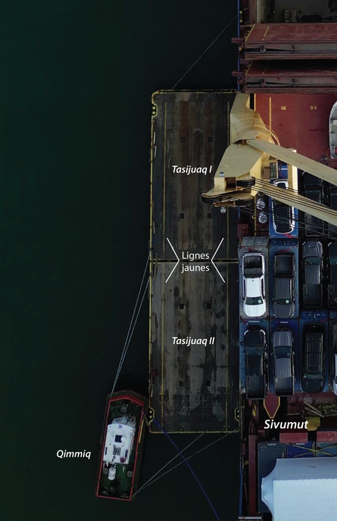 Figure 3. Le Tasijuaq I et le Tasijuaq II, reliés et exploités comme un seul chaland (le Tasijuaq), avec les lignes jaunes peintes sur toute la longueur de son pont. Le Tasijuaq est amarré le long du côté bâbord du Sivumut, le Qimmiq étant attaché au chaland selon une disposition de remorquage à couple.