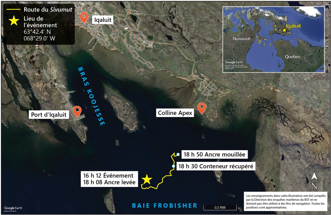 Figure 4. Carte montrant le lieu de l’événement et la trajectoire du navire jusqu’aux positions de mouillage du Sivumut, avec une image en médaillon de la carte montrant Iqaluit (Source des deux images : Google Earth, avec annotations du BST)