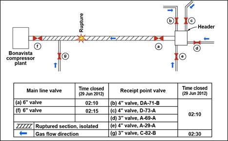 • À 2h15, la vanne de canalisation principale du gazoduc de Bonavista à l'extrémité aval de la conduite à proximité des installations de compression a été fermée par les employés de Bonavista (voir le point (f) de la figure 5).