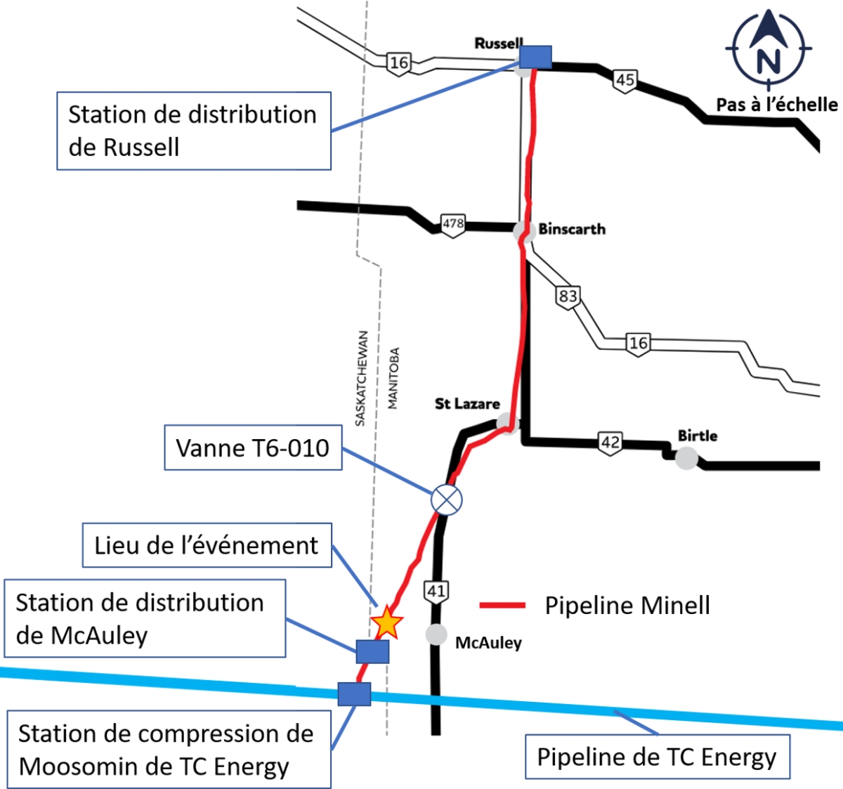 Le pipeline Minell, dont le propriétaire et l’exploitant est Manitoba Hydro, fait partie du réseau provincial de transport de gaz du Manitoba. Il commence près de Moosomin (Saskatchewan) et s’étend sur environ 70 km jusqu’à Russell, où il se termine dans une station de distribution. Le pipeline traverse ces villes ou passe près d’elles : McAuley (270 habitants), St-Lazare (257 habitants), Binscarth (420 habitants) et Russell (1395 habitants) (figure 6).