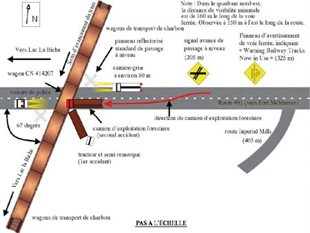 Pour des véhicules roulant vers l'ouest qui étaient à 150 m du passage à niveau, les distances de visibilité permettaient de voir un train arrivant du nord à 160 m du passage à niveau. Les signaux réflectorisés standard de passage à niveau (croix d'avertissement) étaient cachés partiellement par le camion-grue. Le passage à niveau croisait la chaussée à un angle de 67 degrés, et le voie ainsi que la route étaient en alignement. Les abords routiers du passage à niveau étaient en palier (figure 1).
