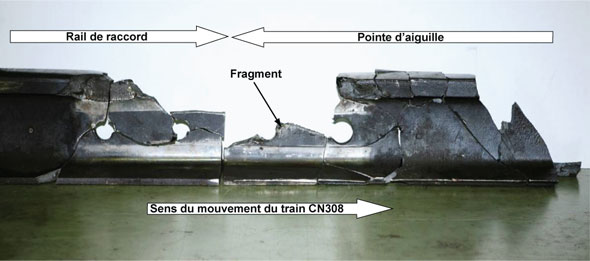 L'examen par le laboratoire du BST (rapport LP 005/2009) des fragments de rail a montré que des fissures horizontales se sont développées entre les trous des boulons du joint. Certaines surfaces de fracture présentaient des surfaces polies et usées causées par le frottement des fragments demeurés en place après la fracture. La majorité des fractures ont été causées par des contraintes excessives; aucun indice de fatigue n'a été observé. L'écrasement du champignon sur les abouts des fragments de rail indique que, sous l'effet du martèlement des roues, la fragmentation du rail a progressé du talon de l'entretoise vers la lame d'aiguille.