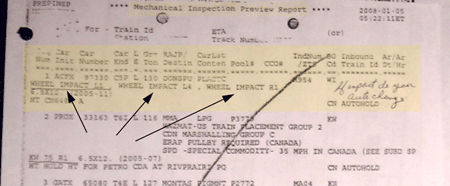 - Le 94e wagon à partir de la tête du train 396, le wagon no ACFX 97330, a vraisemblablement été le premier wagon à dérailler, et la roue L4, placée en position arrière a vraisemblablement été celle qui s'est brisée.