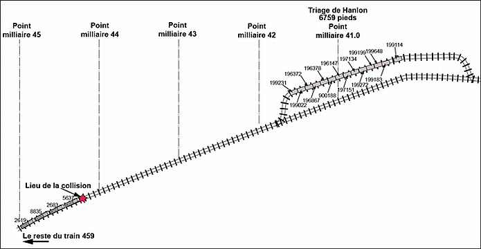 Vers 12 h, le train 459 s'arrête à proximité du point milliaire 44,5 sur la voie principale, au bas d'une pente. L'équipe prévoit immobiliser le train sur la voie principale et circuler vers le sud avec ses locomotives jusqu'à l'extrémité sud de la voie d'évitement de Hanlon en vue d'ajouter une locomotive (qui se trouve à Hanlon) à son train. À 12 h 12, alors que l'équipe se prépare à effectuer le mouvement, une rame de 13 wagons de charbon chargés à la dériveNote de bas de page 3 entre en collision avec la partie avant du train 459. Au moment de la collision, le mécanicien de locomotive et le chef de train se trouvent sur la plate-forme arrière de la troisième locomotive en vue de la séparer de la 4e locomotive. Le mécanicien de locomotive stagiaire est aux commandes de la locomotive de tête (CN 5637).
