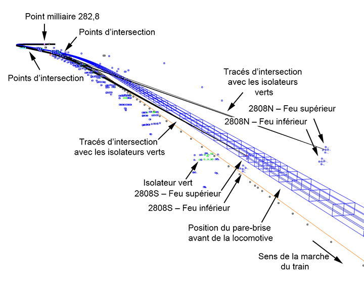 - Pour un train roulant vers l'est qui franchissait la courbe à droite, environ 5 isolateurs verts se trouvaient dans la ligne de visibilité du signal avancé sur la voie nord (2808N).