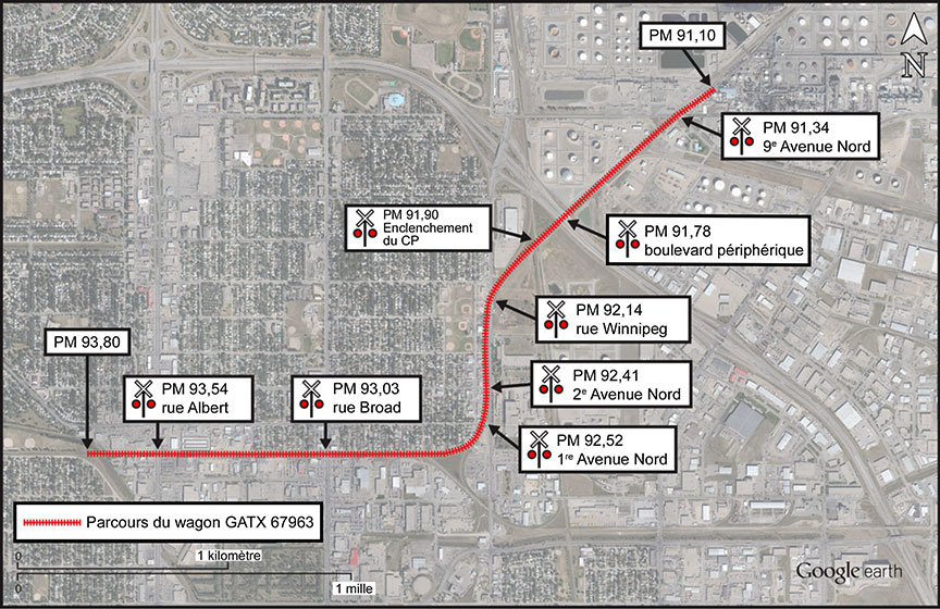 - Le wagon a traversé 7 passages à niveau publics protégés par des dispositifs de signalisation automatique et 1 enclenchement qui croisait la subdivision de Lanigan du Chemin de fer Canadien Pacifique.