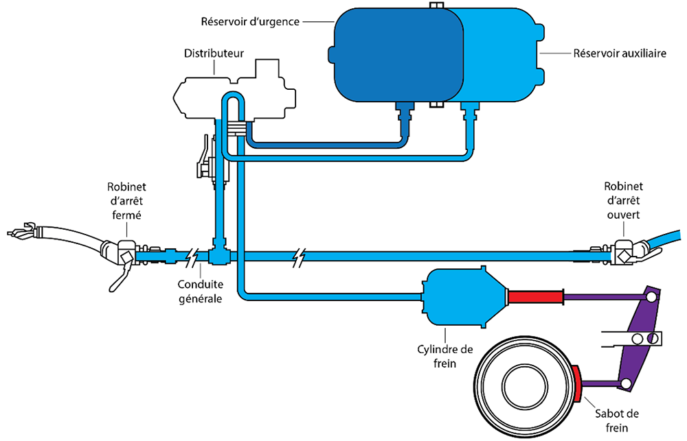 Le système de freinage pneumatique d'un wagon est composé de 4 éléments principaux : la conduite générale, le distributeur, les réservoirs d'air et le cylindre de frein (figure 4). La conduite générale est un tuyau qui relie les wagons les uns aux autres jusqu'à la locomotive de tête. Elle sert à alimenter en air comprimé les réservoirs du matériel roulant et à communiquer au distributeur de serrer ou de relâcher les freins.