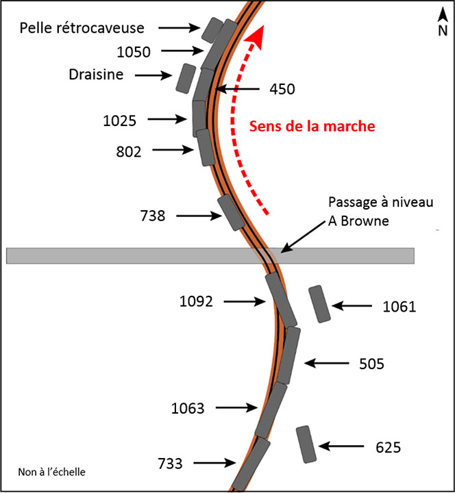 Au premier point de déraillement, les 7 wagons déraillés occupaient diverses orientations dans la courbe; ils étaient surtout penchés ou renversés vers le côté haut (à droite) de la courbe (figure 8). Les dommages aux renforts verticaux sur le côté nord de certains wagons (p. ex., le wagon 738) correspondaient aux entailles relevées dans le ballast au nord de la voie. Il n'y avait pas de marques de boudin de roue entre les rails au point de déraillement ni sur les rails ou traverses à l'approche de la courbe. Les wagons avaient basculé avec leurs chargements de grumes éparpillés dans toute la courbe et sur le dessus de certains des wagons déraillés. Le 7e wagon (wagon 738) avait déraillé dans la sortie de la courbe, tout juste au nord du passage à niveau A Browne.