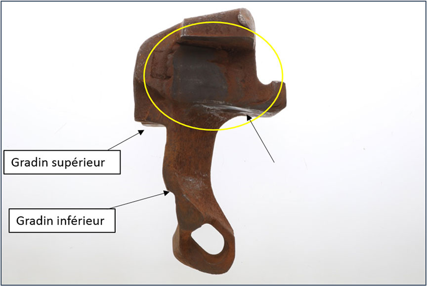 - Douze trous susceptibles de recevoir des crampons étaient présents sur la rampe de déraillement, dans les brides plates pour traverse de la boîte-guide. On a récupéré seulement 8 crampons de dérailleur sur le site.