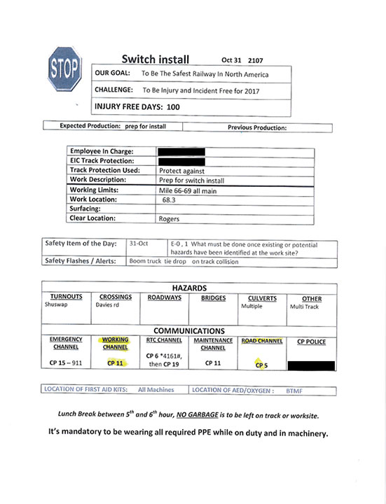 Le contremaître a informé tous les sous-contremaîtres et travailleurs contractuels sous sa protection directe et le superviseur qu'un train vers l'est allait emprunter la voie Connaught dans environ 1 heure. Contrairement aux directives de l'Engineering on Track Safety/Task Assessment Booklet (livret de l'ingénierie – sécurité en voie et évaluation de la tâche) du Chemin de fer Canadien Pacifique (CP), aucune séance officielle d'information sur les travaux n'a eu lieu pour informer tous les employés et entrepreneurs du changement à l'itinéraire d'acheminement des trains. À ce moment, le train vers l'est n'était pas encore arrivé sur les lieux, et son équipe n'avait pas encore demandé l'autorisation de circuler dans la zone de travaux.