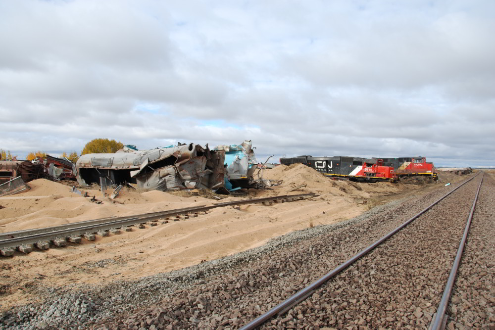 À partir d'environ 20 pieds à l'ouest de l'aiguillage est de la voie de Landis Producer Co-op, il y avait des marques d'abrasion fraîches sur les traverses entre les rails, ce qui suggère que l'essieu s'est rompu à cet endroit. Après la rupture de l'essieu et le déraillement de l'essieu monté, le bogie arrière du wagon CEFX 350816 a été traîné sur environ 4000 pieds jusqu'au lieu de l'empilement principal des wagons déraillés (figure 3).