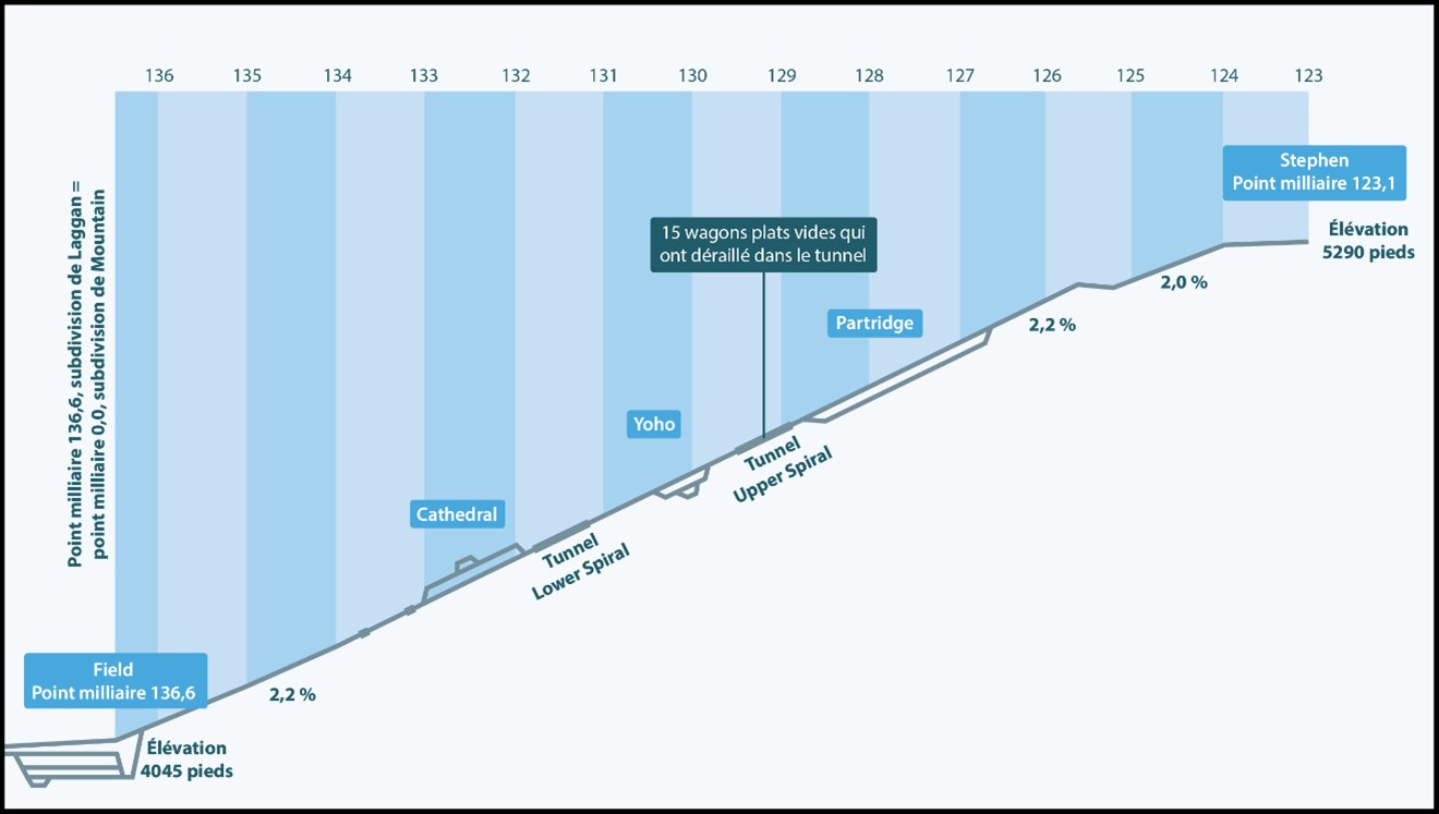 Une inspection a permis de déterminer qu’un total de 15 wagons vides avaient déraillé dans le tunnel Upper Spiral (figure 1). Il n’y a pas eu d’incendie et aucune marchandise dangereuse n’était en cause lors du déraillement. Personne n’a été blessé.