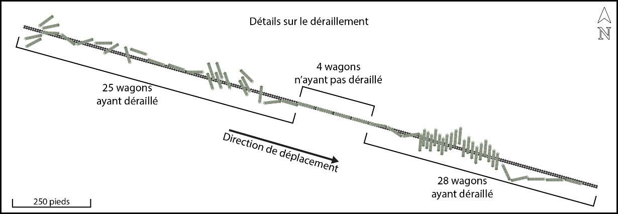Le train s’était séparé après le 26e wagon. Il y avait un écart d’environ 30 longueurs de wagon entre ce wagon et les 2 empilements de wagons déraillés. Le 1er empilement comptait 28 wagons (de la 27e à la 54e position), et le 2e empilement en comptait 25 (de la 59e à la 83e position). Entre eux, 4 wagons étaient restés sur la voie et n’avaient pas déraillé (figure 3).